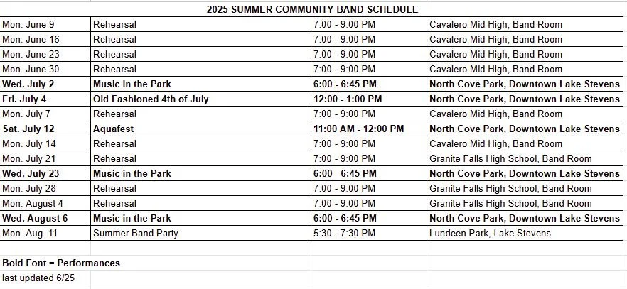 If you are interested in becoming a band member, please fill out the form below! There is also a yearly fee of $25 which goes towards the band’s funding. Prior to our performances, we rehearse on Monday evenings from 7:00-9:00PM in Lake Stevens.